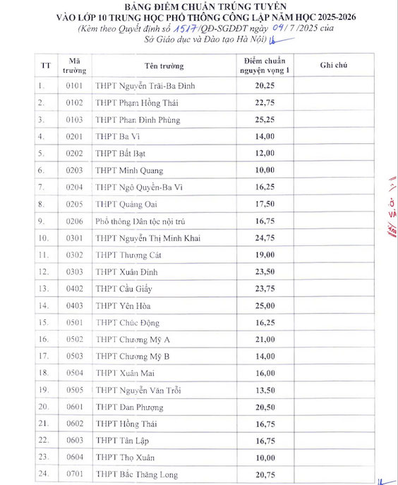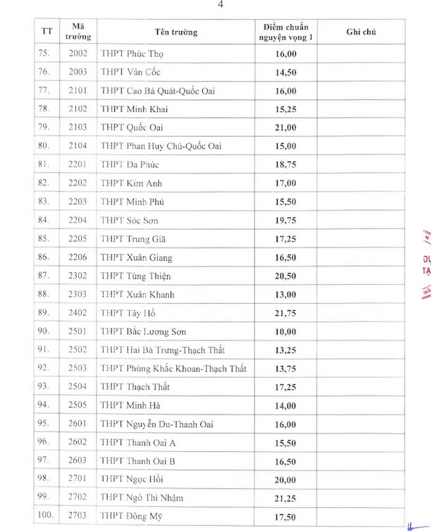 | 4 | THPT Tây Hồ | 37,75 | 7,55 | -1 |