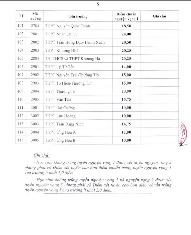 | 17 | THPT Khương Đình | 36,75 | 7,35 | -1,5 |