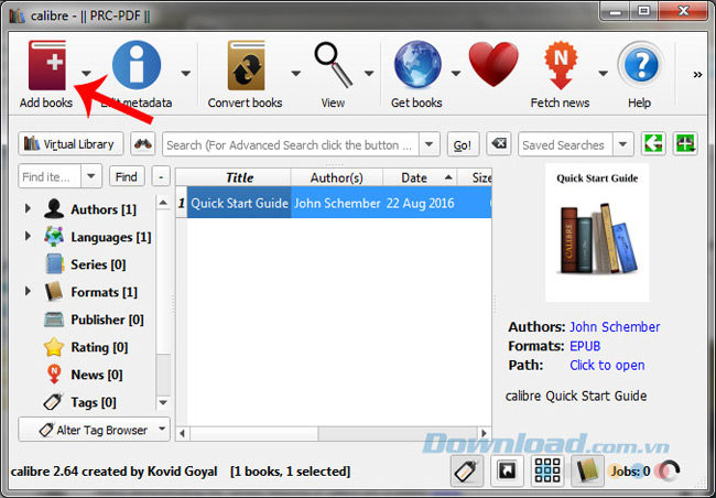 Bước 1: Khi cài đặt hoàn tất, một giao diện chính của phần mềm này sẽ hiện ra như dưới đây. Để bắt đầu sử dụng, chúng ta chuột trái vào Add books để lấy file PRC cần dùng.