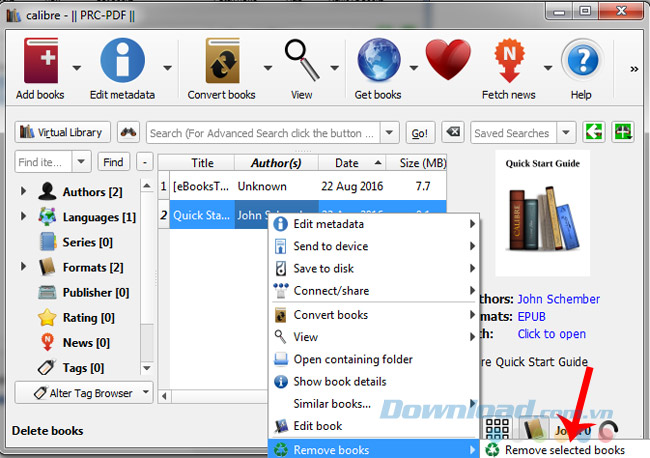 Bước 3: Nếu chọn nhầm file và muốn xóa đi, có thể chuột phải vào file đó, chọn Remove books / Remove selected books.