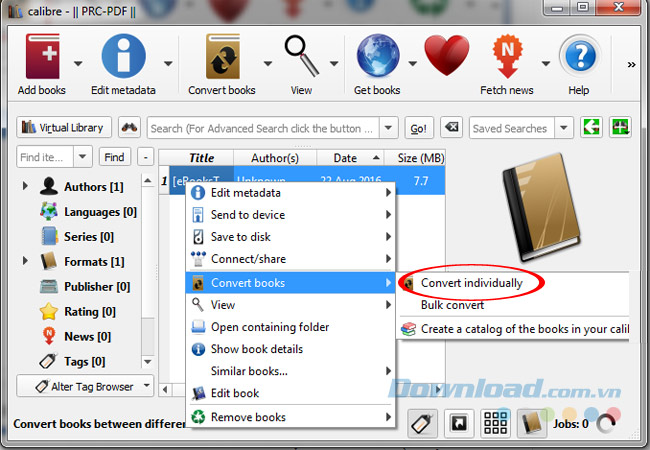 Bước 4: Để bắt đầu quá trình chuyển đổi, cần chuột phải vào file PRC, chọn mục Convert books, chọn tiếp Convert invidually.