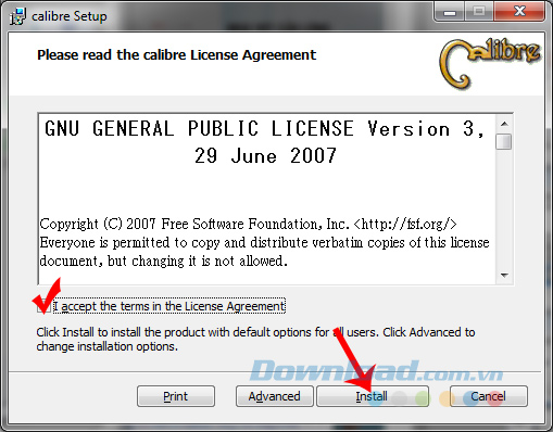 Bước 2: Tick vào mục I accept the terms... rồi Install.