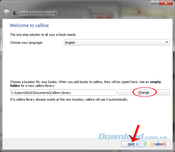Đặc biệt, khi sử dụng phần mềm này, Calibre sẽ yêu cầu bạn có một thư mục riêng để lưu trữ các file sau khi convert. Có thể chọn nhanh vị tri được gợi ý rồi Next để chuyển tới bước tiếp theo, hoặc vào Change để thay đổi.