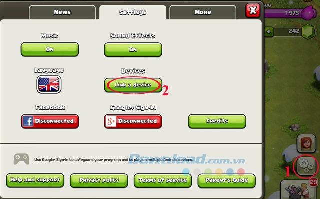 Bước 1: Mở game Clash of Clans trên cả hai thiết bị Android và iOS, rồi nhấn vào phần Settings trên hai máy. Sau đó, cửa sổ Settings xuất hiện nhấn chuột vào nút Link a device.