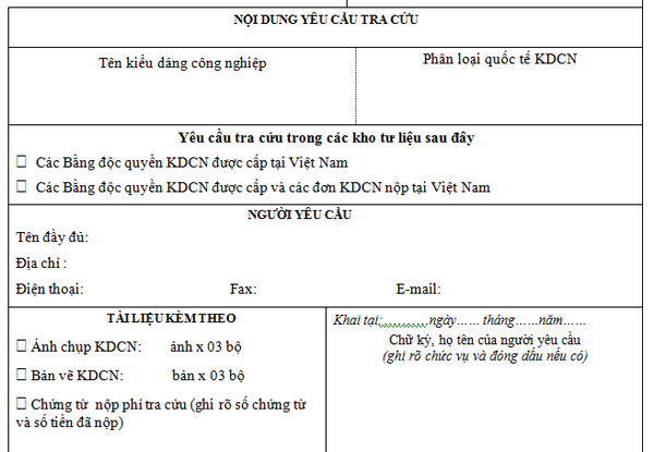 Người có tên dưới đây yêu cầu Cục Sở hữu trí tuệ tra cứu kiểu dáng công nghiệp:.................