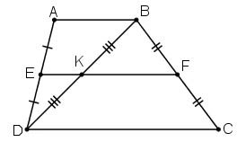 Hình thang ABCD có đáy AB, CD. Gọi E, F, K theo thứ tự là trung điểm của AD, BC, BD. Chứng minh ba điểm E, K, F thẳng hàng.