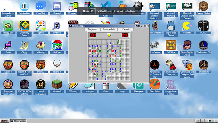 Như đã nói, EmuOS chỉ là một giao diện Web chứa các phần mềm và game từ những hệ điều hành xa xưa. Các bạn chỉ cần click đúp vào để mở chúng lên. Đầu tiên, chúng ta sẽ thử với trò chơi huyền thoại dò mìn (Minesweeper).