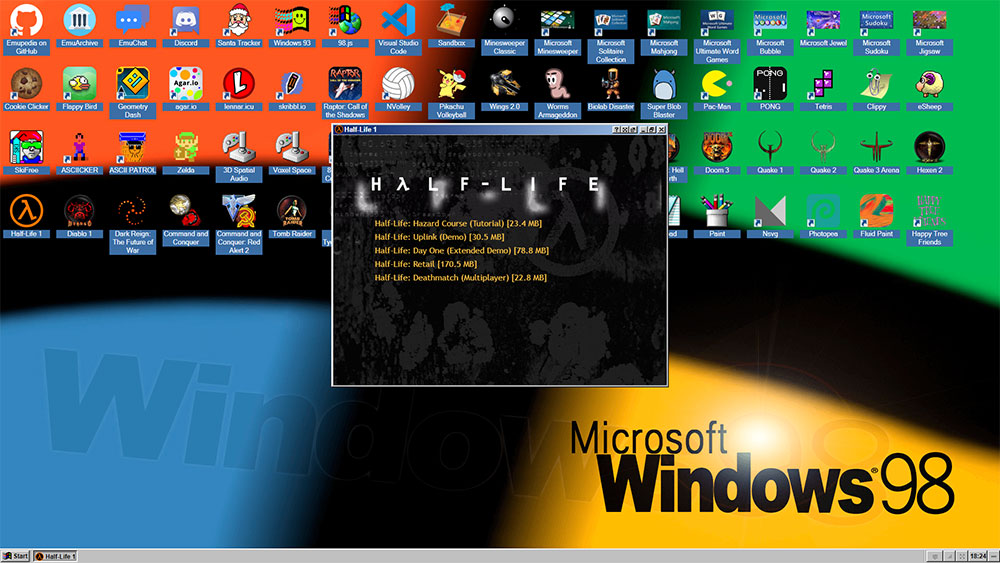 Các bạn cũng có thể chơi Half-life 1 ngay trên trình duyệt với EmuOS. Sau khi nhấn chọn vào game, các bạn có thể chọn một trong các bản Halflife hiện lên trên màn hình để chơi. Mỗi bản lại có dung lượng nặng nhẹ khác nhau và sẽ cần thời gian để tải về dữ liệu.