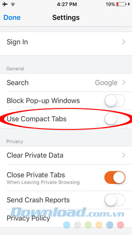 Gạt Close Private Tabs sang phải để kích hoạt chế độ tự đóng tab ẩn danh