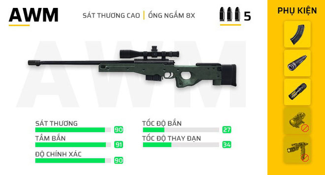 Khẩu AWM được gọi là "vua bắn tỉa" đã không còn xa lạ gì với game thủ Free Fire. Kết hợp thêm với MP40 nhỏ nhẹ, có tốc độ bắn cao để chiến đấu với những kẻ thù ở tầm gần thì đây là một bộ đôi súng cực kỳ mạnh.