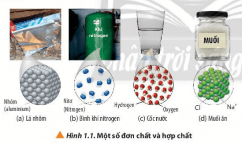 Quan sát hình 1.1 hãy chỉ ra các đơn chất và hợp chất. Viết công thức hóa học của chúng