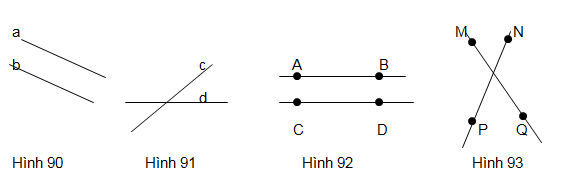 Đọc tên hai đường thẳng song song, hai đường thẳng cắt nhau trong hình 90, Hình 91, Hình 92, Hình 93
