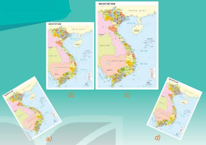 Nhìn những tấm bản đồ hành chính Việt Nam ở bên, ta thấy chúng giống nhau về hình dạng, hơn nữa, tấm a) và tấm d) còn giống nhau cả về kích thước. Toán học thể hiện điều đó như thế nào? Qua chuyên đề này, ta sẽ có câu trả lời.