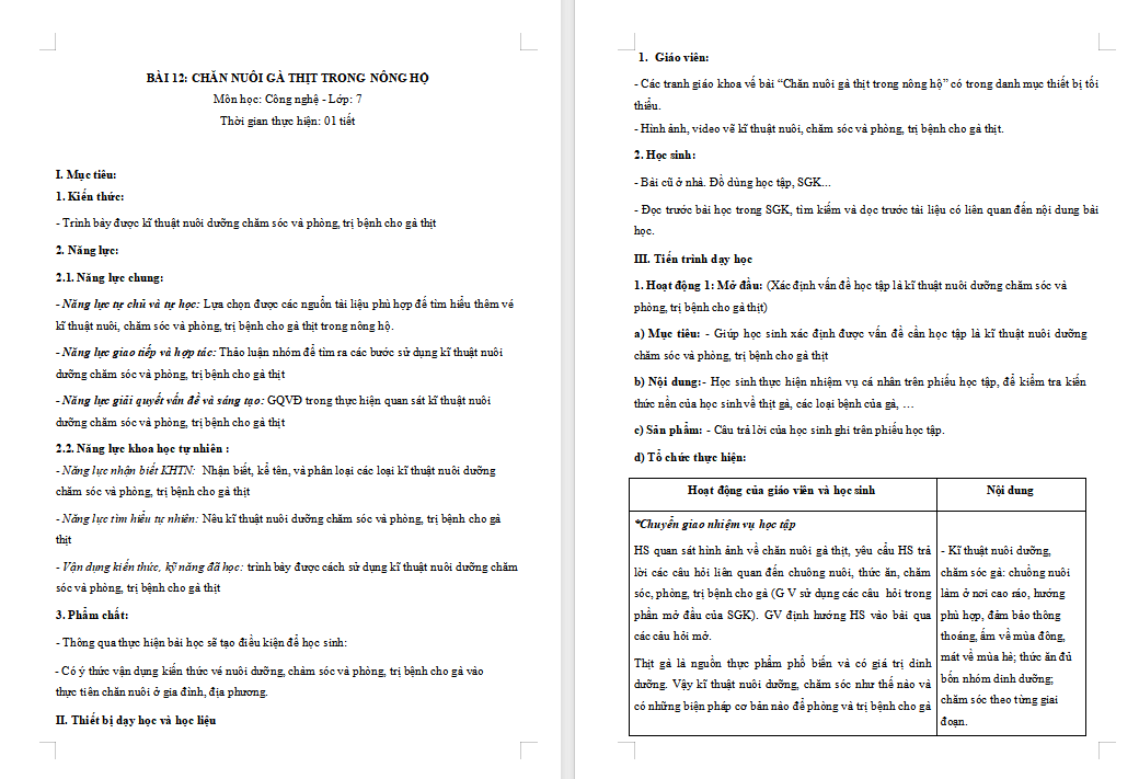Giáo án Công nghệ 7 Bài 12: Chăn nuôi gà thịt trong nông hộ