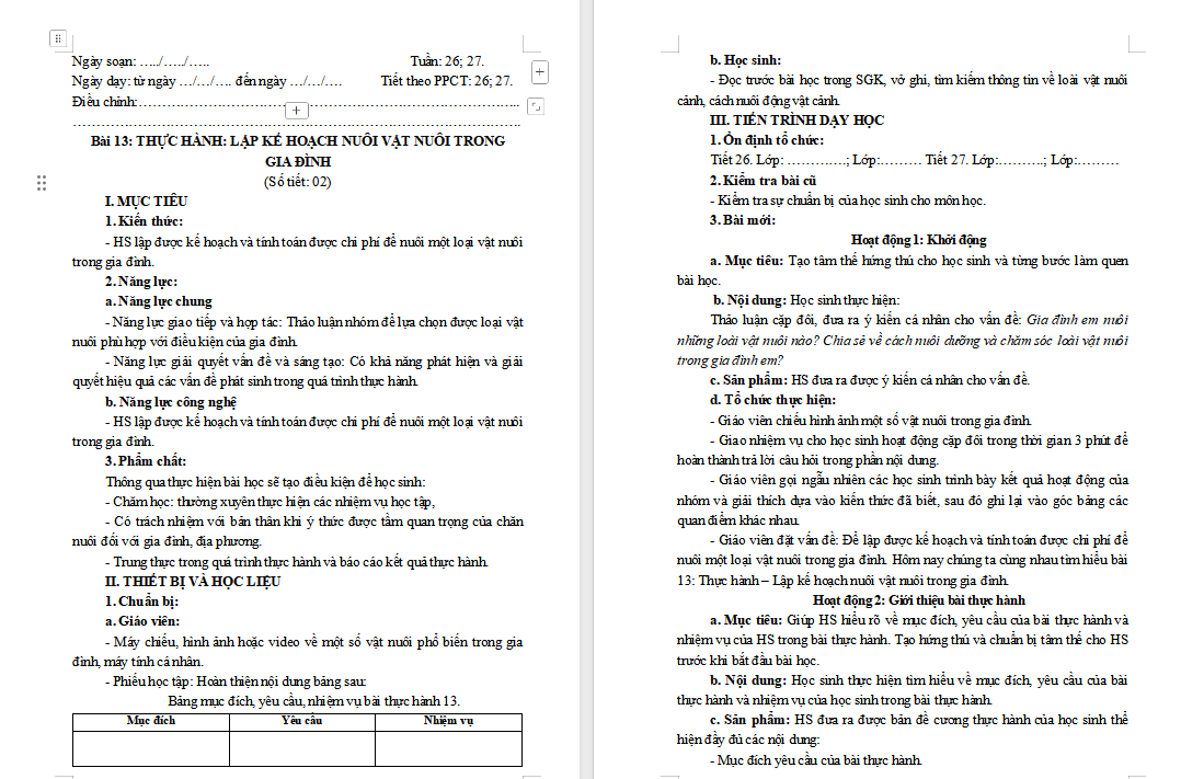 Giáo án Công nghệ 7 Bài 13: Thực hành Lập kế hoạch nuôi vật nuôi trọng gia đình (PPT + Word + Bài tập)