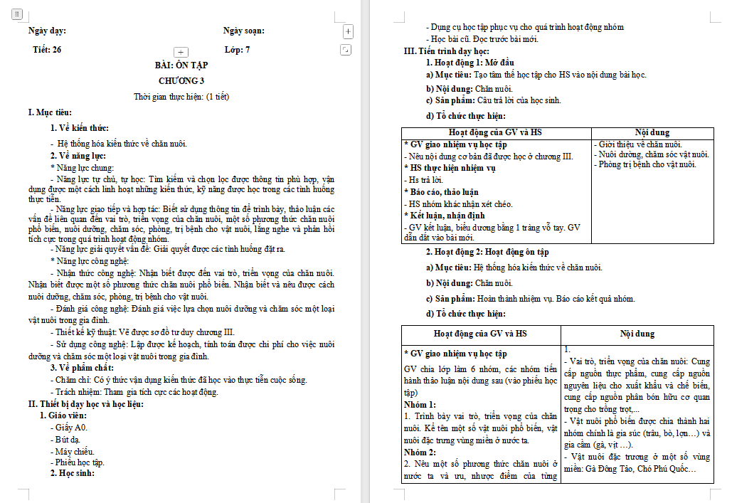 Giáo án Công nghệ 7 Ôn tập chương 3