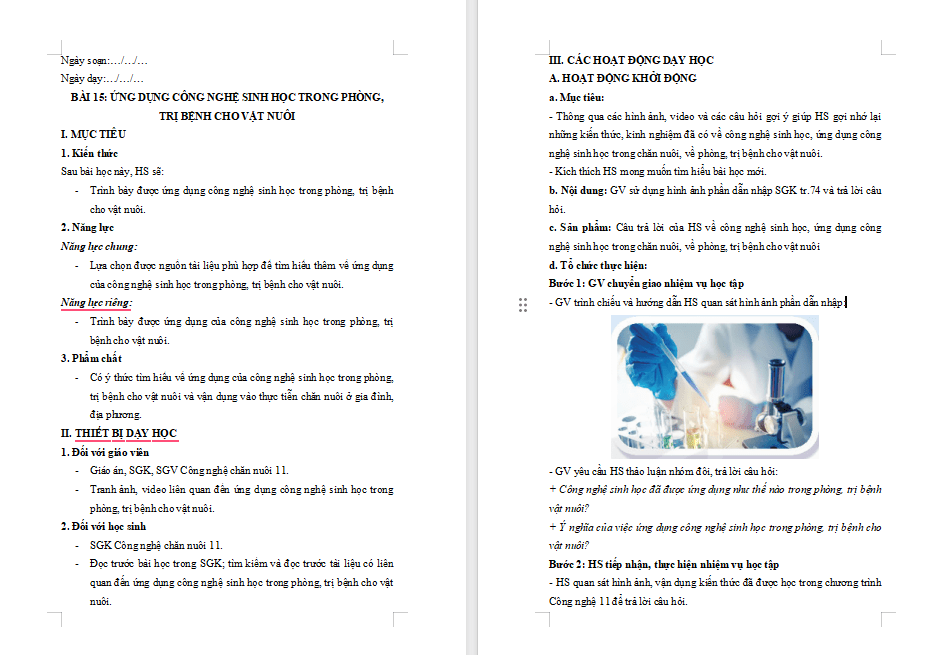 2. Giáo án Công nghệ 11 Bài 15: Ứng dụng công nghệ sinh học trong phòng trị bệnh vật nuôi