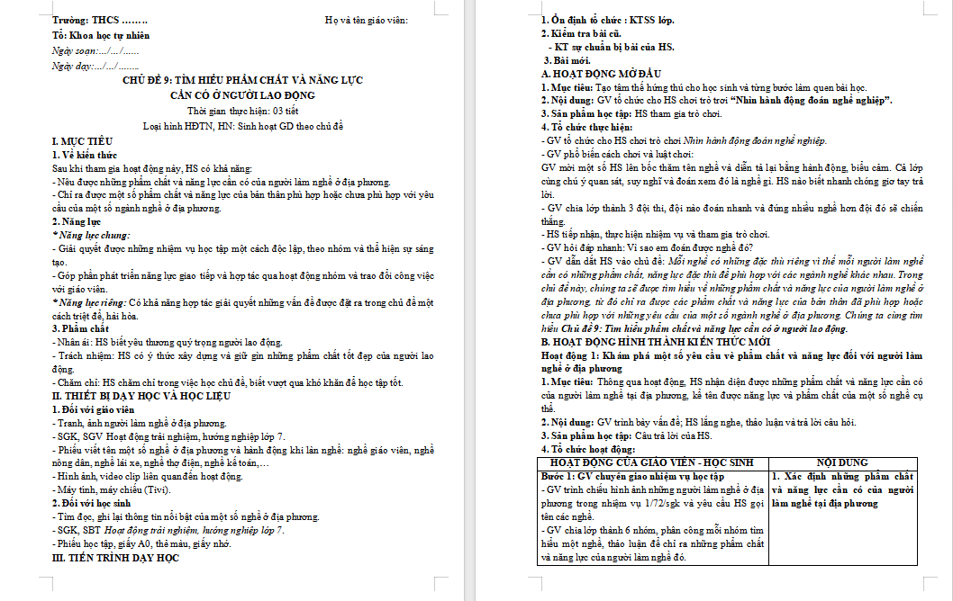 Giáo án HĐTN 7 Chủ đề 9 Tìm hiểu phẩm chất và năng lực cần có ở người lao động