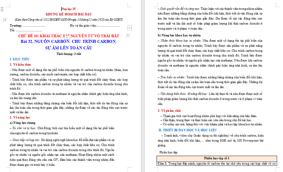 Xem thêm Giáo án KHTN 9 Bài 32: Nguồn carbon Chu trình carbon Sự ấm lên toàn cầu trong file tải về