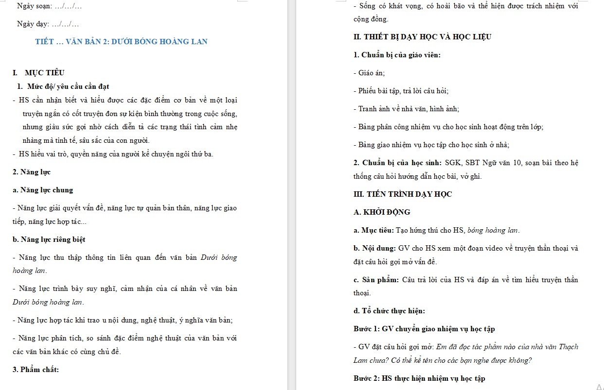 Giáo án Bài Dưới bóng hoàng lan Ngữ văn 10 KNTT