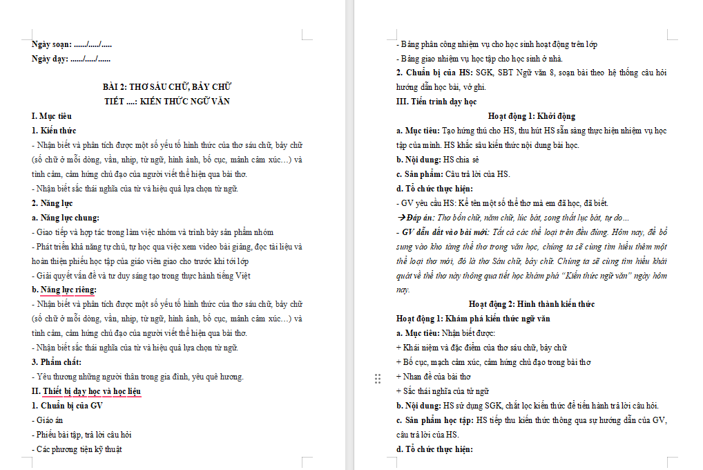 Mời các bạn tải file về để xem trọn bộ Giáo án Ngữ văn 8 Bài 2 Kiến thức ngữ văn