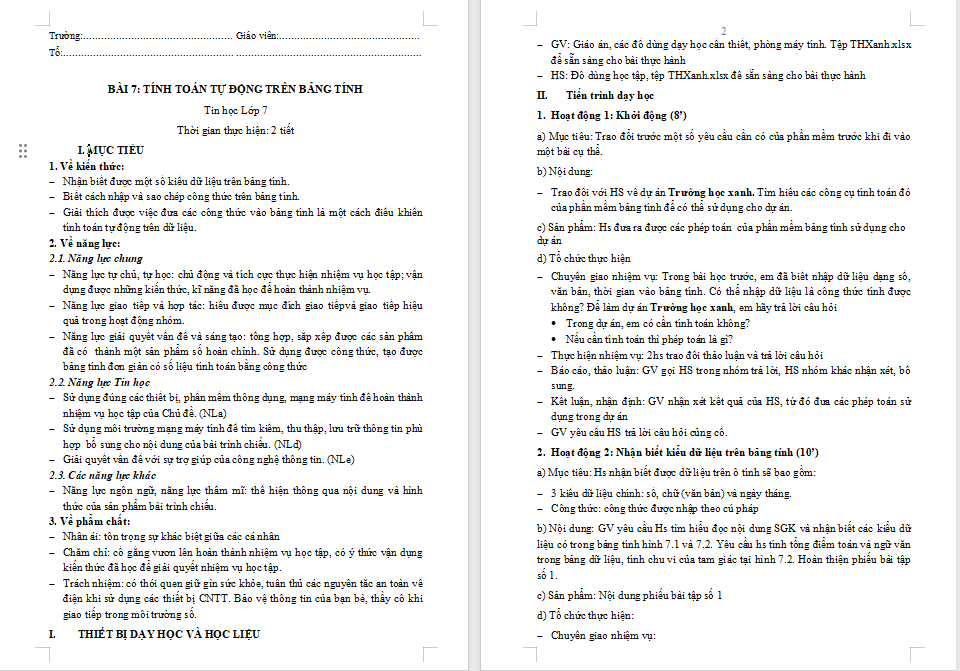 Giáo án PowerPoint Tin học 7 Bài 7: Tính toán tự động trên bảng tính Giáo án Tin học lớp 7 Kết nối tri thức (Word + PPT)