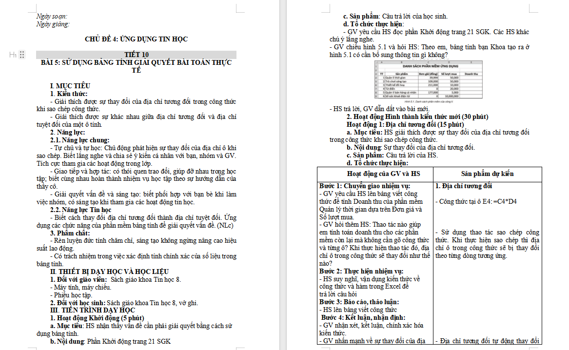 Giáo án Tin học 8 Bài 5 Sử dụng bảng tính giải quyết bài toán thực tế