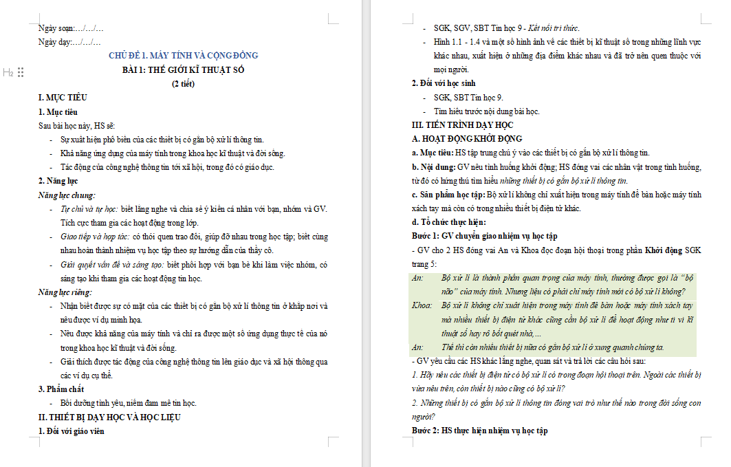 Giáo án Tin học 9 Bài 1 Thế giới kĩ thuật số