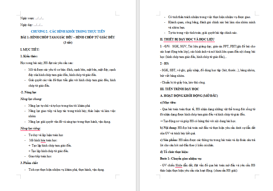 Giáo án Toán 8 Bài 1: Hình chóp tam giác đều Hình chóp tứ giác đều được thiết kế chi tiết bám sát nội dung trong SGK Chân trời sáng tạo với nhiều hình ảnh đẹp mắt, giúp bài giảng trở nên hấp dẫn hơn. Qua đó khơi dậy được sự tò mò, chú ý của người học và khuyến khích người học sáng tạo, khám phá những cái mới. Vậy sau đây là nội dung chi tiết Giáo án PowerPoint Toán 8 Chân trời sáng tạo Bài 1: Hình chóp tam giác đều Hình chóp tứ giác đều mời các bạn tải tại đây.