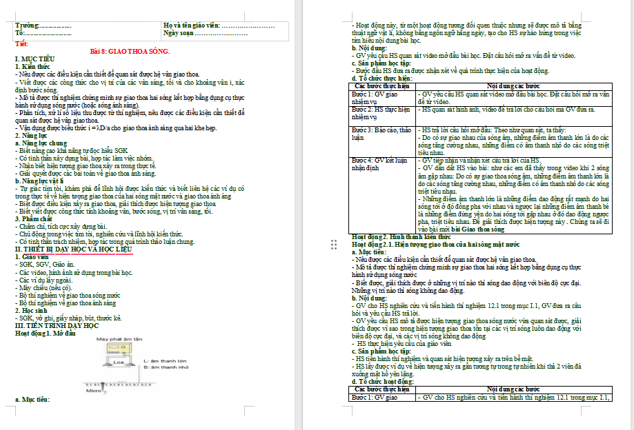 Giáo án Vật lý 11 Bài 8: Giao thoa sóng được thiết kế chi tiết, sinh động với nhiều hình ảnh đẹp mắt, giúp bài giảng trở nên hấp dẫn hơn. Qua đó khơi dậy được sự tò mò, chú ý của người học và khuyến khích người học sáng tạo, khám phá những cái mới. Vậy sau đây là nội dung chi tiết Giáo án Vật lí 11 Chân trời sáng tạo Bài 8: Giao thoa sóng mời các bạn tải tại đây.