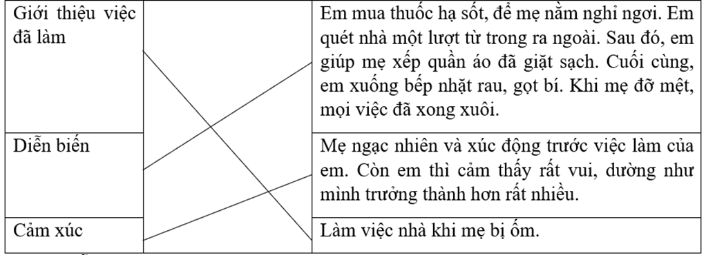 - Phần diễn biến, học sinh nêu rõ cụ thể mình đã làm gì: Em mua thuốc hạ sốt, để mẹ nằm nghỉ ngơi. Em quét nhà một lượt từ trong ra ngoài. Sau đó, em giúp mẹ xếp quần áo đã giặt sạch. Cuối cùng, em xuống bếp nhặt rau, gọt bí. Khi mẹ đỡ mệt, mọi việc đã xong xuôi.