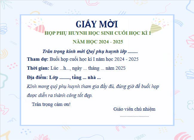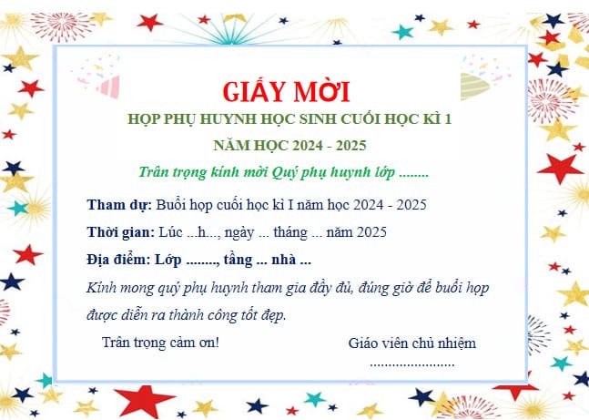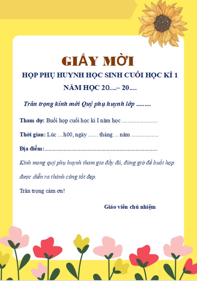 Giáo viên chủ nhiệm lớp .................. xin kính mời Ông (bà) đúng........giờ.......phút ngày........tháng........năm..........đến tại lớp............ trường ................ để dự buổi họp phụ huynh học sinh.