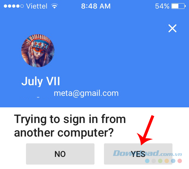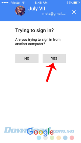 Sau đó đăng nhập tài khoản vào ứng dụng (tài khoản này và tài khoản đã đăng nhập trên máy tính phải giống nhau). Một thông báo "Trying to sign in?" xuất hiện, các bạn chọn Yes để xác nhận.