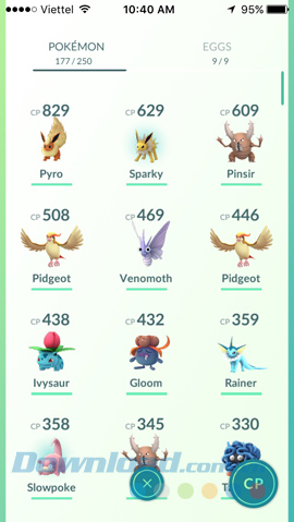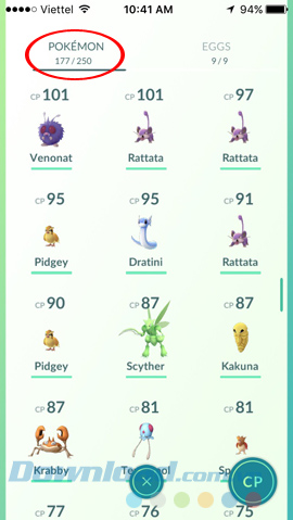 Từ giao diện chính của game, chạm vào biểu tượng Pokeball / Pokemon. Danh sách hình ảnh và số lượng các Pokemon đã thu phục được sẽ hiện ra.