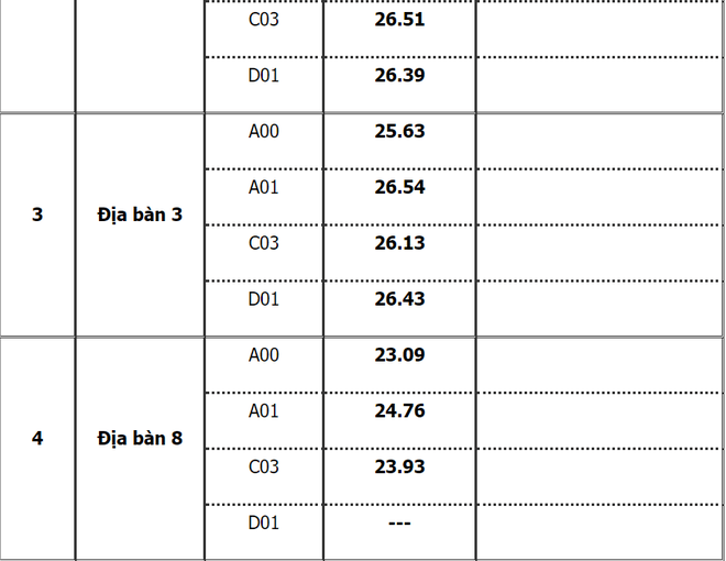 A00 (Toán, Vật lý, Hóa học); A01 (Toán, Vật lý, Tiếng Anh); C03 (Toán, Ngữ văn, Lịch sử); D01 (Toán; Ngữ văn; Tiếng Anh).