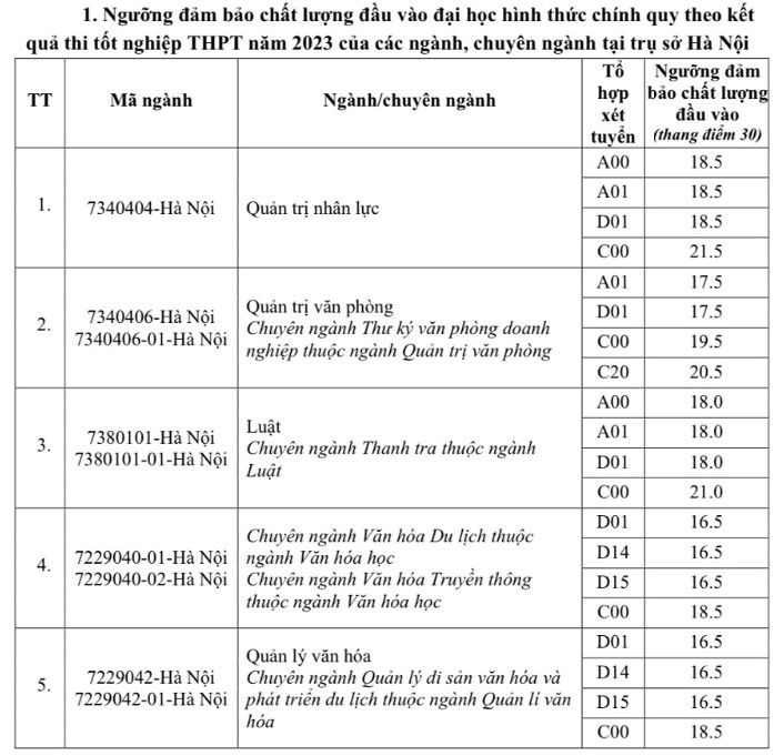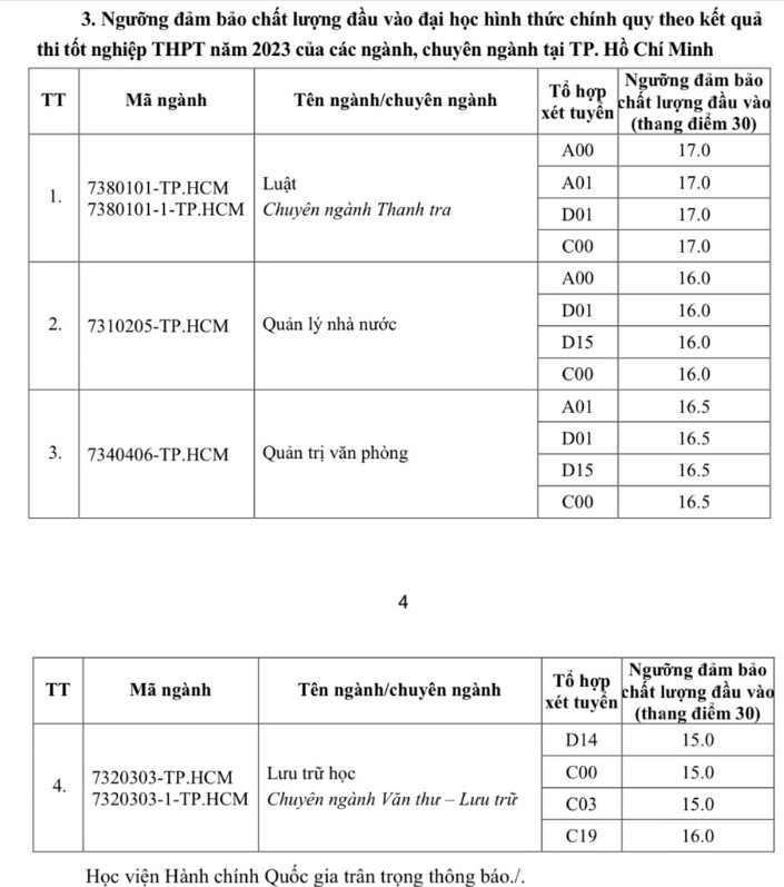 Ngày 18/7/2023, Học viện Hành chính Quốc gia ban hành Thông báo số 1564/TB-HĐTS về ngưỡng đảm bảo chất lượng đầu vào đại học hệ chính quy dựa vào kết quả xét tuyển cuối cấp THCS năm 2023.