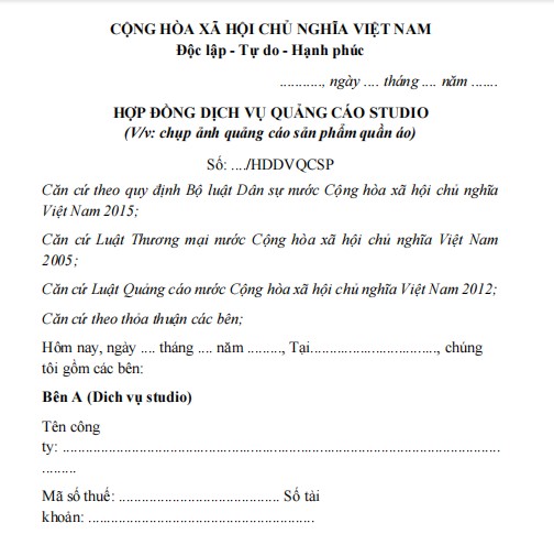 Hợp đồng chụp ảnh sản phẩm Mẫu hợp đồng dịch vụ quảng cáo studio