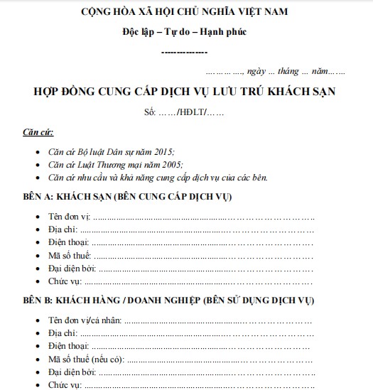 Nội dung hợp đồng thường bao gồm thông tin về các bên tham gia, phạm vi dịch vụ, thời gian lưu trú, giá cả, phương thức thanh toán, cũng như các điều khoản về trách nhiệm, quyền lợi và nghĩa vụ liên quan. Việc ký kết hợp đồng giúp đảm bảo tính minh bạch, hạn chế tranh chấp và tạo cơ sở pháp lý vững chắc cho quá trình thực hiện dịch vụ. Đồng thời, hợp đồng còn thể hiện sự chuyên nghiệp trong hoạt động kinh doanh, góp phần nâng cao uy tín của đơn vị cung cấp dịch vụ lưu trú. Đây là tài liệu cần thiết để các bên tham khảo, sử dụng trong quá trình giao kết và thực hiện dịch vụ một cách thuận lợi, đúng quy định pháp luật, mời các bạn tham khảo.