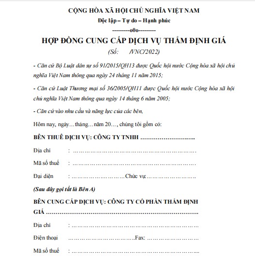 HỢP ĐỒNG CUNG CẤP DỊCH VỤ THẨM ĐỊNH GIÁ