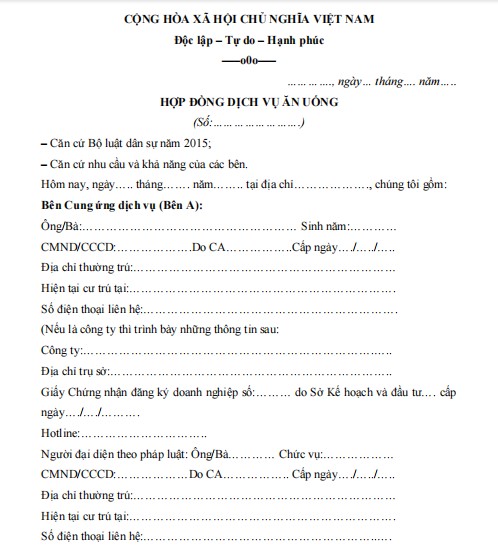 HỢP ĐỒNG DỊCH VỤ ĂN UỐNG