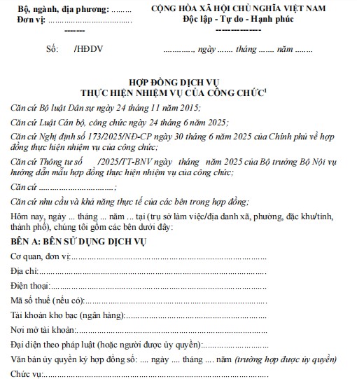 Căn cứ Thông tư số /2025/TT-BNV ngày tháng năm 2025 của Bộ trưởng Bộ Nội vụ hướng dẫn mẫu hợp đồng thực hiện nhiệm vụ của công chức;
