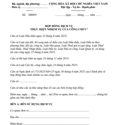 Căn cứ Nghị định số 173/2025/NĐ-CP ngày 30 tháng 6 năm 2025 của Chính phủ về hợp đồng thực hiện nhiệm vụ của công chức;