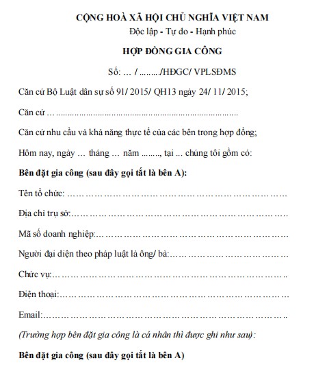 Mẫu hợp đồng gia công mới nhất được cập nhật bám sát các quy định của Bộ luật Dân sự và các văn bản hướng dẫn về quản lý chất lượng sản phẩm hiện hành. Tài liệu này cung cấp khung pháp lý đầy đủ cho các điều khoản thiết yếu như: định mức nguyên vật liệu, quy trình bàn giao vật tư, tiêu chuẩn kỹ thuật của thành phẩm, thời hạn thanh toán và trách nhiệm bồi thường khi xảy ra sai sót hoặc hư hỏng. Việc sử dụng biểu mẫu chuẩn giúp các bên kiểm soát chặt chẽ quá trình sản xuất, quản lý tốt tài sản bàn giao và hạn chế tối đa các rủi ro pháp lý phát sinh từ việc chậm tiến độ hay vi phạm bản quyền kiểu dáng công nghiệp. Đây là công cụ đắc lực cho các doanh nghiệp sản xuất và thương mại trong việc tối ưu hóa quy trình vận hành và xây dựng mối quan hệ hợp tác bền vững, minh bạch, mời các bạn cùng tham khảo.