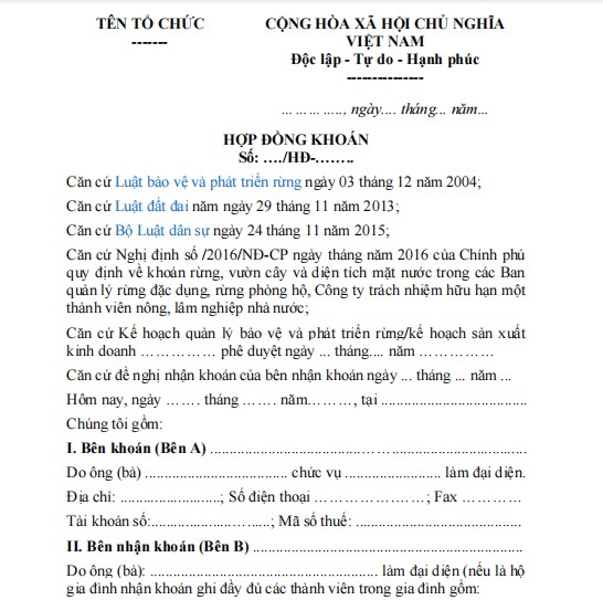 Mẫu hợp đồng được thiết kế theo đúng biểu mẫu tại Phụ lục ban hành kèm theo Nghị định 168/2016/NĐ-CP, đáp ứng yêu cầu quản lý nhà nước về lâm nghiệp trong giai đoạn hiện nay, mời các bạn cùng tham khảo.