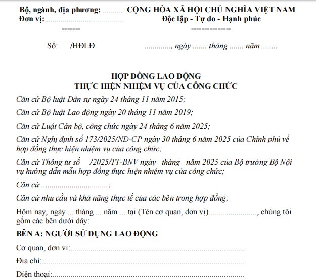 Căn cứ Thông tư số /2025/TT-BNV ngày tháng năm 2025 của Bộ trưởng Bộ Nội vụ hướng dẫn mẫu hợp đồng thực hiện nhiệm vụ của công chức;