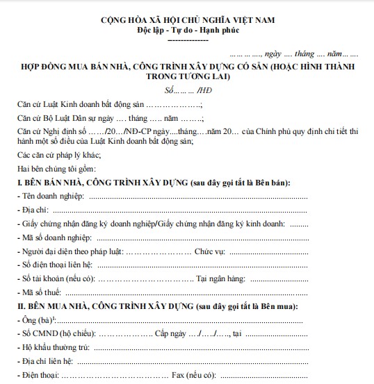 HỢP ĐỒNG MUA BÁN NHÀ, CÔNG TRÌNH XÂY DỰNG CÓ SẴN (HOẶC HÌNH THÀNH TRONG TƯƠNG LAI)Căn cứ Luật Kinh doanh bất động sản ..........................;