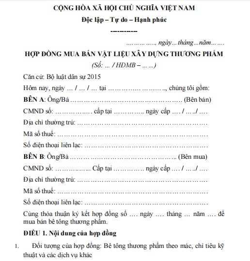 1. Mẫu hợp đồng mua bê tông