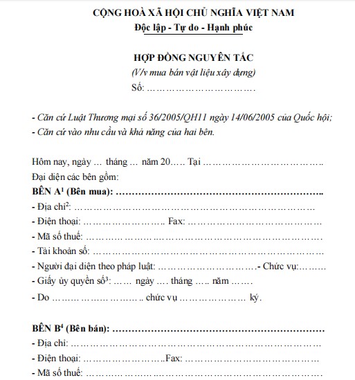 Tìm hiểu thêm »Mẫu Hợp đồng nguyên tắc mua bán vật liệu xây dựng là văn bản pháp lý dùng để ghi nhận thỏa thuận ban đầu giữa bên bán và bên mua trước khi thực hiện hoạt động giao dịch thực tế. Đây là căn cứ quan trọng nhằm xác định quyền lợi, trách nhiệm, tiêu chuẩn hàng hóa, giá cả, phương thức thanh toán và các điều khoản liên quan trong quá trình cung ứng vật liệu xây dựng.