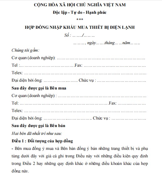 1. Biểu mẫu hợp đồng nhập khẩu mua thiết bị điện lạnh