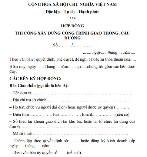 Nội dung hợp đồng quy định rõ phạm vi công việc, tiến độ thực hiện, tiêu chuẩn kỹ thuật, giá trị hợp đồng, phương thức thanh toán, trách nhiệm của các bên cũng như các điều khoản về nghiệm thu, bảo hành và xử lý vi phạm. Việc sử dụng mẫu hợp đồng chuẩn giúp đảm bảo tính minh bạch, chặt chẽ trong quản lý dự án, đồng thời hạn chế rủi ro phát sinh trong quá trình thi công. Đây là căn cứ pháp lý quan trọng để các bên thực hiện đúng quyền và nghĩa vụ theo quy định của pháp luật về xây dựng và đấu thầu, mời các bạn cùng tham khảo mẫu hợp đồng dưới đây.